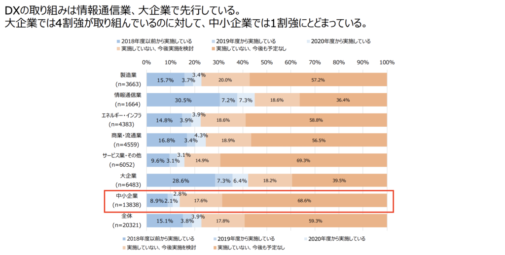 しかしながら、いまだ中小企業の取組は進まず、総務省「デジタル・トランスフォーメーションによる経済へのインパクトに関する調査研究」では、2020年度までにおいて中小企業でDXに取り組んでいる企業は1割強にとどまっているという結果も出ています。